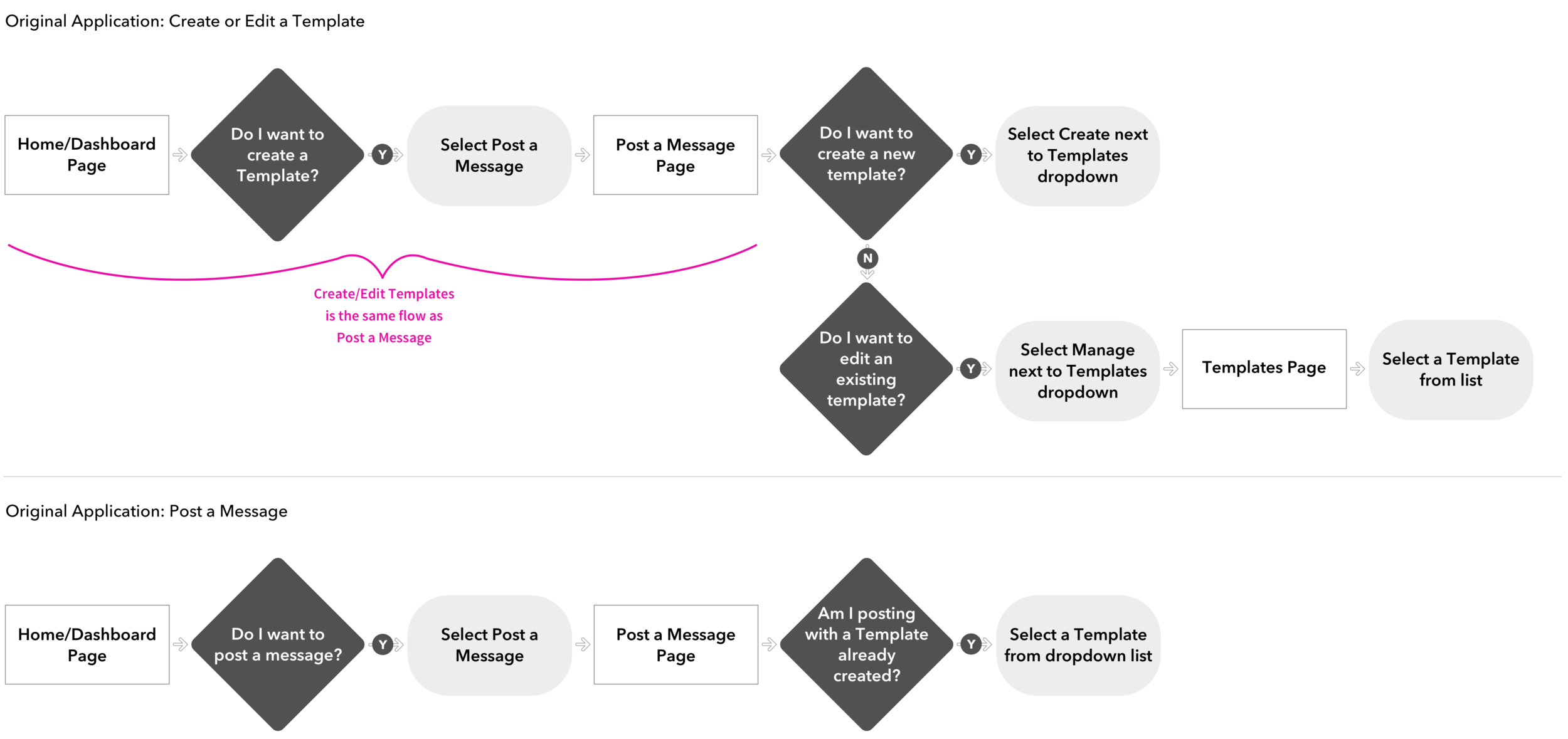 In the original application, the process for creating or editing a template wasn't intuitive or easily findable. The only location to access Templates was from the Post a Message page within the message selection options.